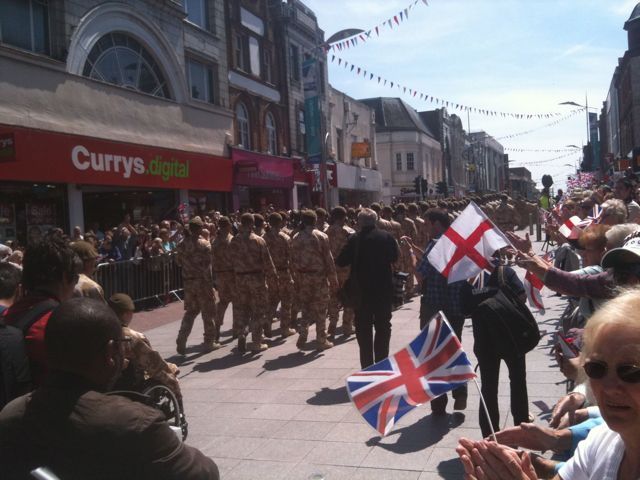 The 1st Battalion The Royal Anglian Regiment, back from their third tour of duty in Afganistan are currently marching down Southend High Street, being cheered by thousands of locals.